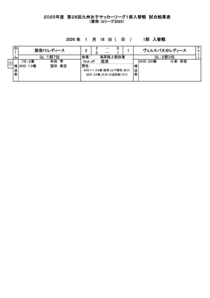 2025年度 第28回九州女子サッカーリーグ1部入替戦 試合結果です。